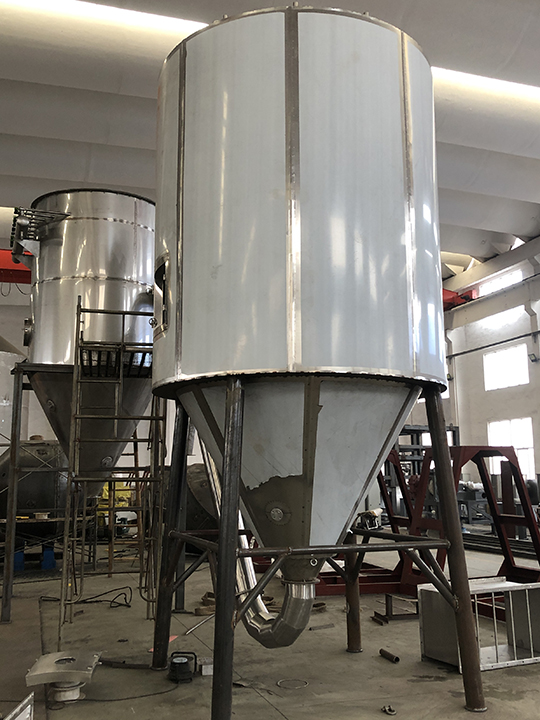 空气经过滤和加热,进入干燥器顶部空气分配器,热空气呈螺旋状均匀地进入干燥室。料液经塔体顶部的高速离心雾化器,(旋转)喷雾成极细微的雾状液珠,与热空气并流接触在极短的时间内可干燥为成品。成品连续地由干燥塔底部和旋风分离器中输出,废气由风机排空。