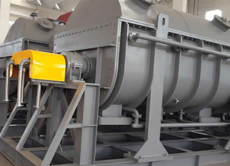 污泥干燥机的设备内部有两根或者四根空心转动轴,空心轴上密集并联排列着扇面楔形中空叶片,结构设计特殊巧妙。轴体相对转动,利用角速度相同而线速度不同的原理和结构巧妙地达到了轴体上污泥的自清理作用,^大限度地防止了污泥干化过程中的“抱轴”现象。以快速度使得污泥在干化过程中迅速冲过“胶粘化相区域”。同时巧妙的结构使得污泥在干化过程中达到了双向剪切状态。被干燥的污泥由螺旋送料机定量地连续送入干燥机的加料口,污泥进入器身后,通过桨叶的转动使污泥翻转、搅拌,不断更新加热介面,与器身和桨叶接触,被充分加热,使污泥所含的表面水分蒸发。