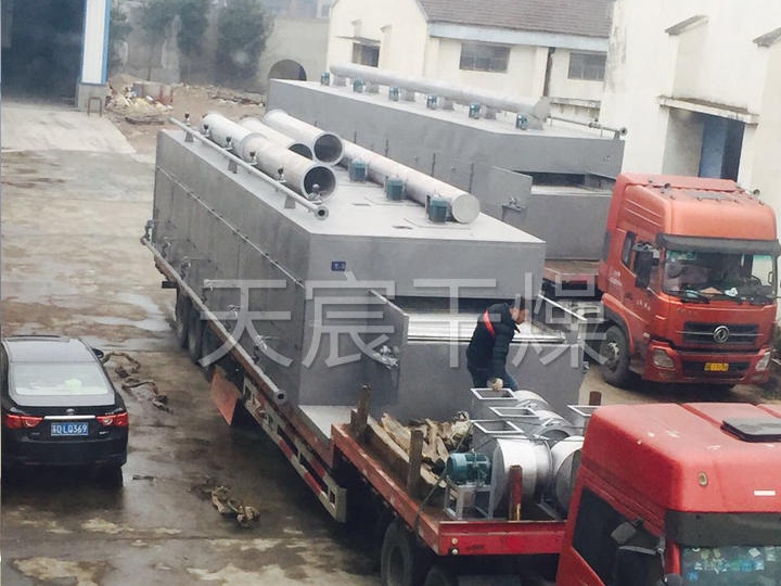 物料由加料器均匀地铺在网带上,由传动装置拖动在干燥机内移动。干燥机由若干单元组成,每一单元热风独立循环,部分尾气由专门排湿风机排出,废气由调节阀控制,热气由下往上或由上往下穿过铺满物料的网带完成热量与质量传递的进程,带走物料水份。网带缓慢移动,运行速度可根据物料温度自由调节,干燥后的成品连续落入收料器中。上下循环单元根据用户需要可灵活配备,单元数量亦可根据需要选取。